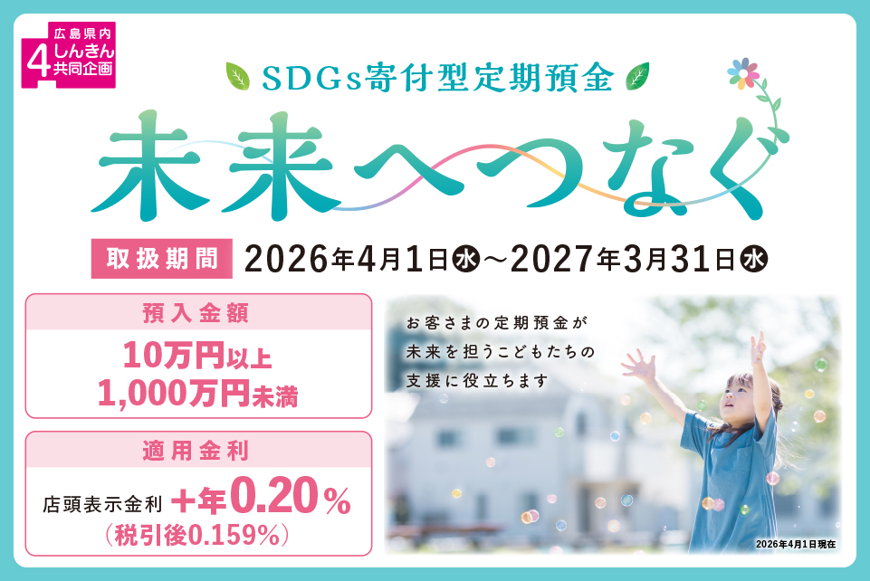 (1) 寄付内容 ・定期預金総額(2027年3月末時点の残高)の0.01%を当金庫が寄付します(お客さまの負担はございません)。 〈寄付先〉公益財団法人ひろしまこども夢財団 〈ホームページ〉ikuchan.or.jp/yumezaidan/ (2) 最低寄付金額 ・4信金合計で100,000円を寄付します。 ※4信金とは、呉信用金庫、広島信用金庫、しまなみ信用金庫、広島みどり信用金庫を示します。 ※定期預金総額の0.01%(4信金合計)< 100,000円の場合 |